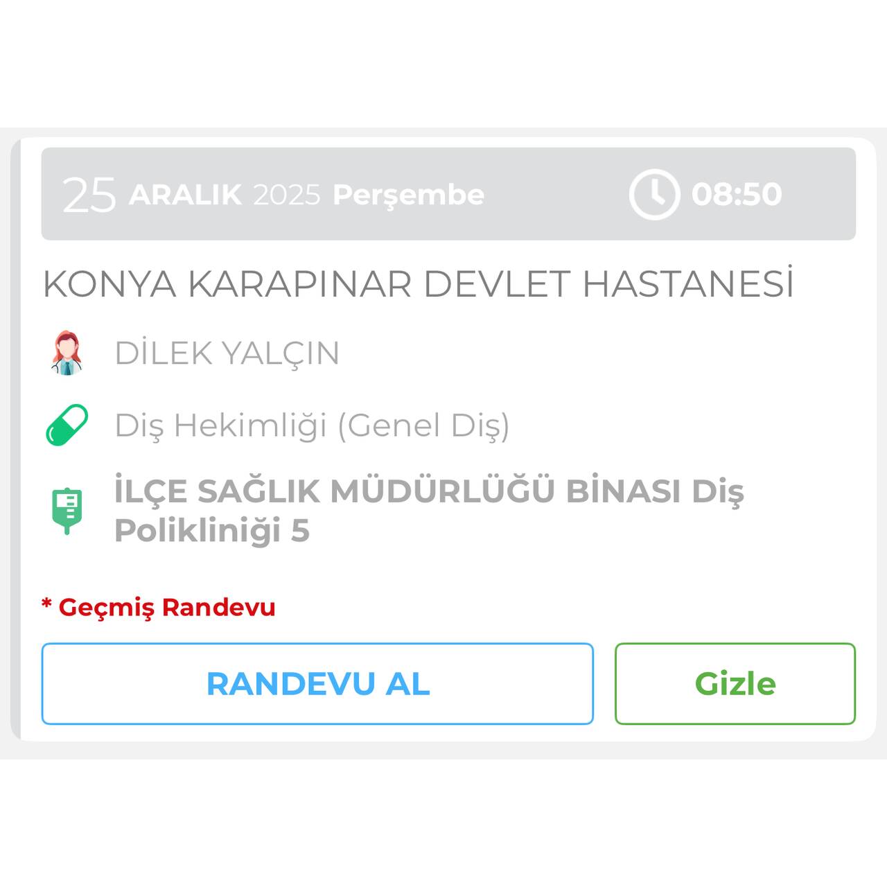 İşini özveriyle ve hakkıyla yapan tüm doktorlarımıza ve sağlık çalışanlarımıza saygı ve teşekkürlerimi sunarım. Ancak ilgili diş hekimi hakkında gerekli değerlendirmenin yapılmasını, hizmet kalitesinin gözden geçirilmesini ve benzer mağduriyetlerin yaşanmaması adına gerekli önlemlerin alınmasını talep ediyorum.